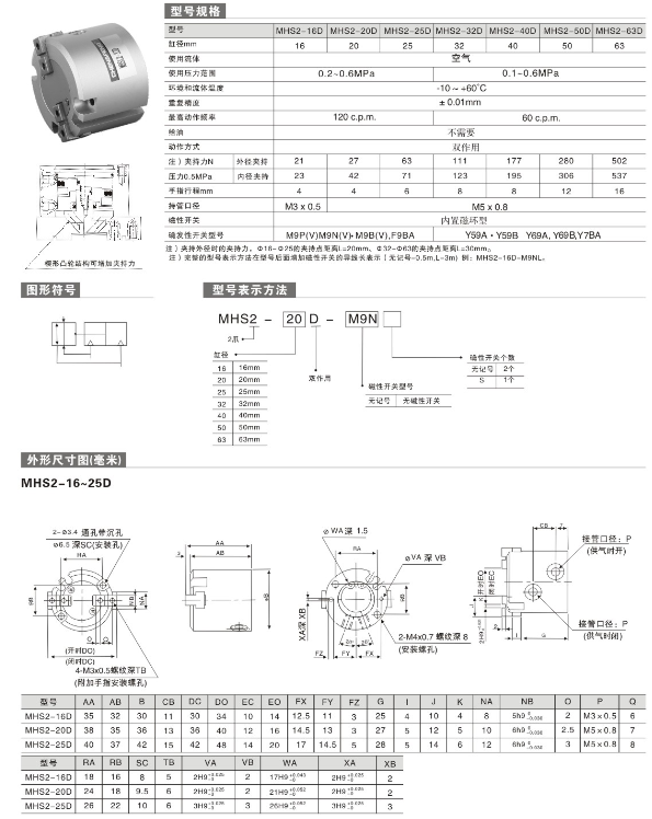 圓柱形氣爪氣缸 MHS2-16D,MHS2-20D,MHS2-25D,MHS2-32D,MHS2-40D,MHS2-50D,MHS2-63D