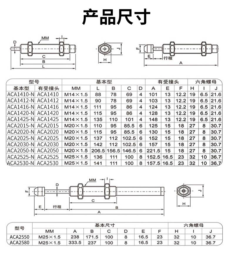 油壓緩沖器ACA0806,ACA1007,ACA1210,ACA1215,ACA1412,ACA1416,ACA1420,ACA1616,ACA1620,ACA1625,ACA2020,ACA2025,ACA2030,ACA2040,ACA2525,ACA2550,ACA2725,ACA2750,ACA3325,ACA3350,ACA3625,ACA3650氣缸阻尼器