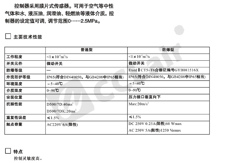 型號: 壓力控制器 D500/7DZ切換差不可調(diào)