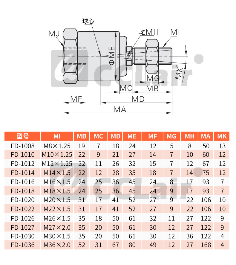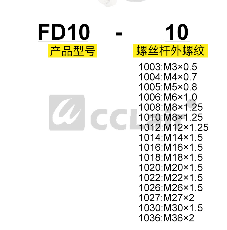 FD1003(M3*0.5),FD1004(M4*0.7),FD1005(M5*0.8),FD1006(M6*1),FD1008(M8*1.25),FD1010(M10*1.25),FD1010(M10*1.5),FD1012(M12*1.25),FD1012(M12*1.5),FD1012(M12*1.75),FD1014(M14*1.5),FD1016(M16*1.5),FD1016(M16*2),FD1018(M18*1.5),FD1020(M20*1.5)浮動接頭
