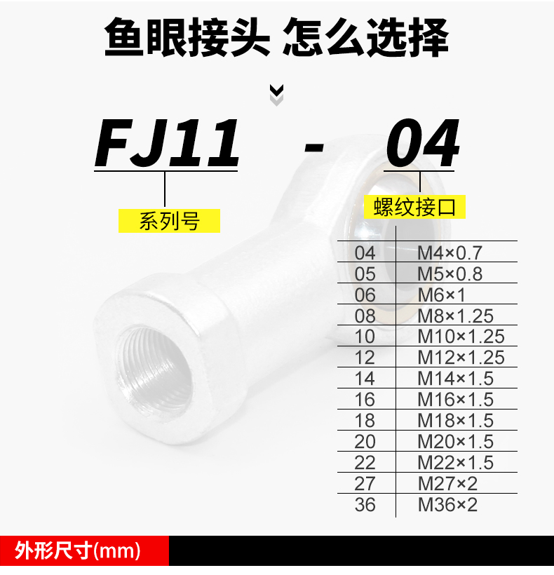 FJ11-04(M4*0.7),FJ11-05(M5*0.8),FJ11-06(M6*1),FJ11-08(M8*1.25),FJ11-10(M10*1.25),FJ11-12(M12*1.25),FJ11-14(M14*1.5),FJ11-16(M16*1.5),FJ11-18(M18*1.5),FJ11-20(M20*1.5),FJ11-22(M22*1.5),FJ11-27(M27*2)魚(yú)眼接頭