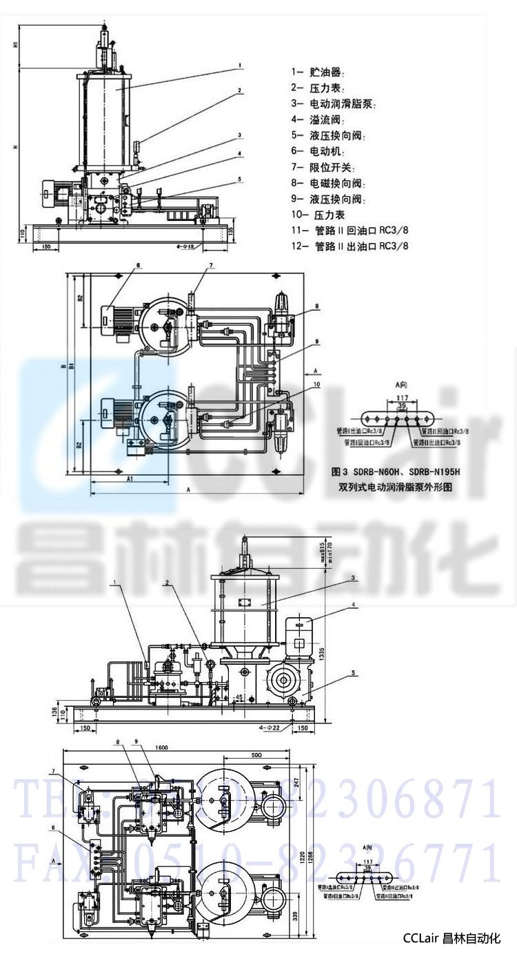 | 1 - 壓力表;2 - 壓力表;3 - 貯油器;4 - 電動(dòng)機(jī);5 - 電動(dòng)潤(rùn)滑脂泵 6 - 液壓換向閥;7 - 電磁換向閥;8 - 液壓換向閥;9 - 限位開(kāi)關(guān) |