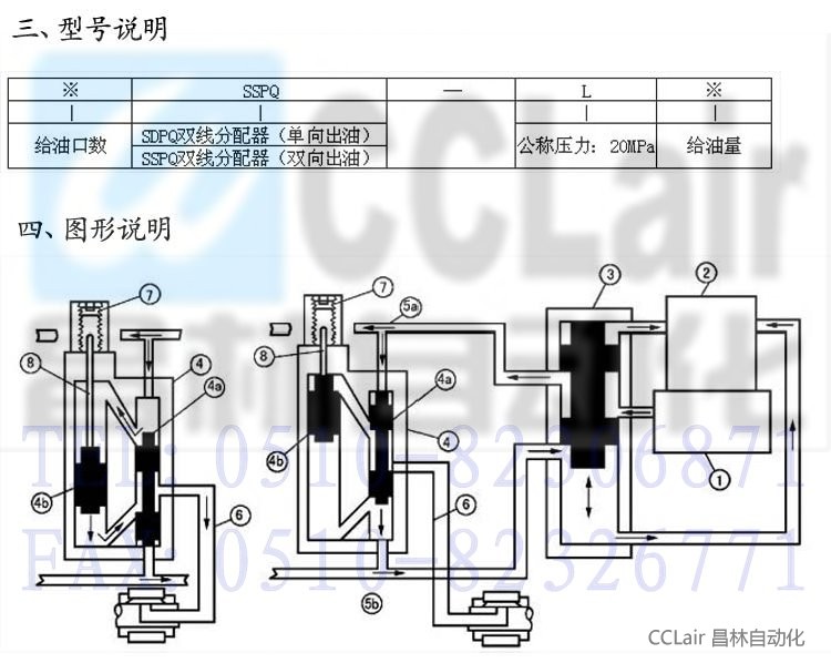 | 雙線分配器有兩個進(jìn)油口,分別與5a.5b供油管連接,當(dāng)其中一條由潤滑泵供油時,另一條則向貯油器開放。 如上圖所示,由泵壓送來的潤滑脂,經(jīng)供油管5a輸送至分配器4,進(jìn)入先導(dǎo)活塞4a上部加壓,將先導(dǎo)活塞4a壓下,此時下部與供油管5b連通卸荷。隨著先導(dǎo)活塞4a的下移,使主活塞4b上腔與先導(dǎo)活塞上腔連通,主活塞下腔與出油口連通,供送的潤滑劑進(jìn)入主活塞上腔,推動主活塞下移,將其下腔的潤滑劑經(jīng)給油管6壓送到潤滑點,完成第一周期的給油動作。 切換至供油管5b供油開始第二個周期的給油動作,分配器活塞按相同的順序反向進(jìn)行前述動作。 分配器每口給油口由主活塞4b的直徑和行程確定,通過調(diào)節(jié)調(diào)整螺釘7,改變主活塞4b的行程,可實現(xiàn)規(guī)定范圍的油量調(diào)節(jié)。 SSPQ-L系列分配器動作原理同上,供油管5a、5b分別供油一次其下部和正面給油口分別排油一次。 |