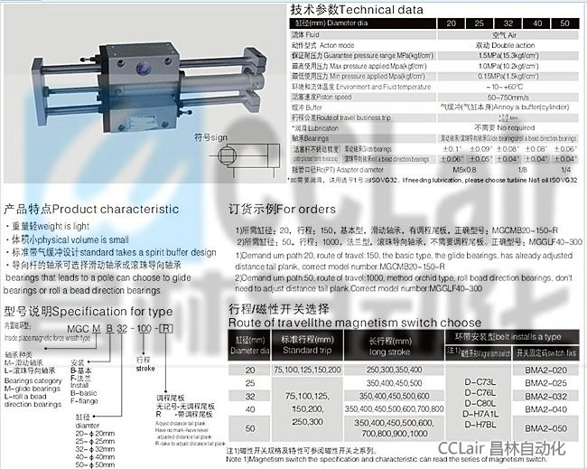 MGCMB40-450,MGCMB40-500,MGCMB40-600,MGCMB40-700,MGCMB40-800,MGCMB50-75,小型帶導桿氣缸