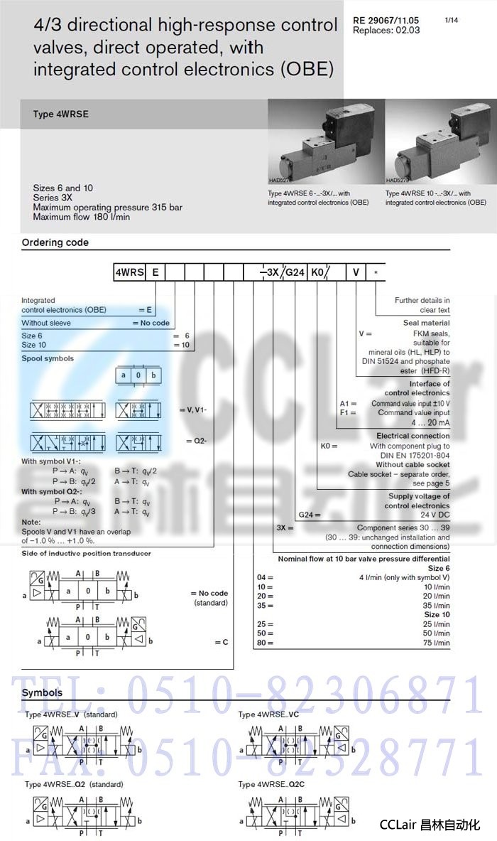4WRSE6Q2-20-3X/G24K0/A1V,4WRSE6V10-3X/G24K0/A1V, 直動(dòng)式方向控制閥,力士樂REXROTH,德國(guó)力士樂