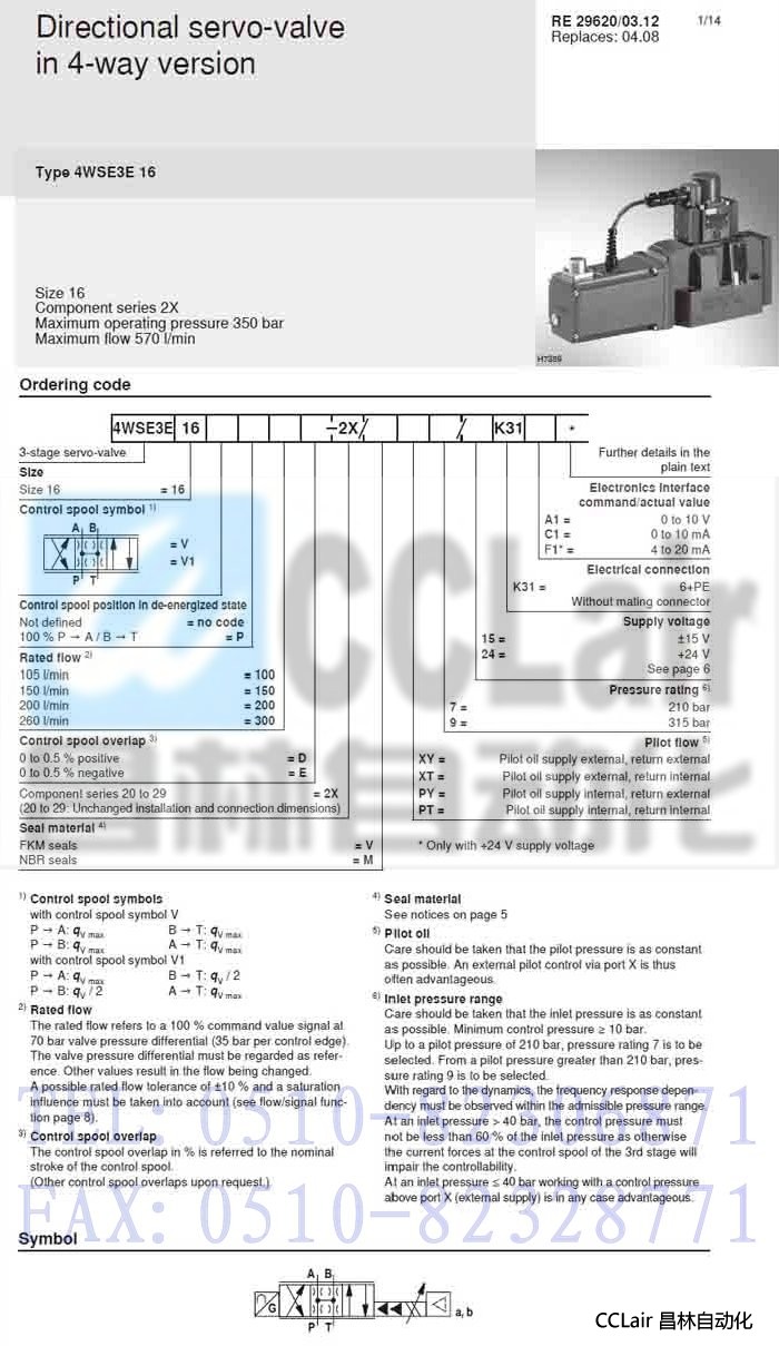 4WSE3E16V300D2X/VXY9/24K31A1,4WSE3E16V300D2X/VXY9/24K31C1, 方向伺服閥,力士樂REXROTH,德國力士樂 |