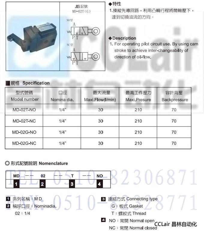 MD-02T-NO,MD-02T-NC,MD-02G-NO,MD-02G-NC,機械式換向閥