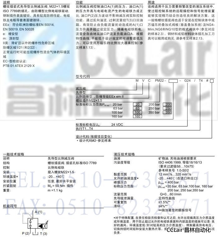 MVCPM22,防爆型先導式比例減壓插裝閥