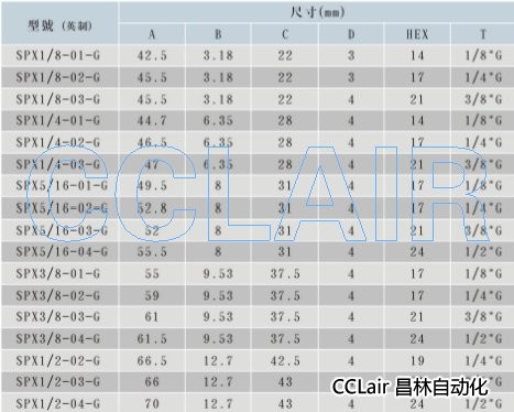 SPX1/8-01-G,SPX1/8-02-G,SPX1/4-02-G,SPX5/16-01-G,SPX3/8-03-G,SPX1/2-04-G,接頭