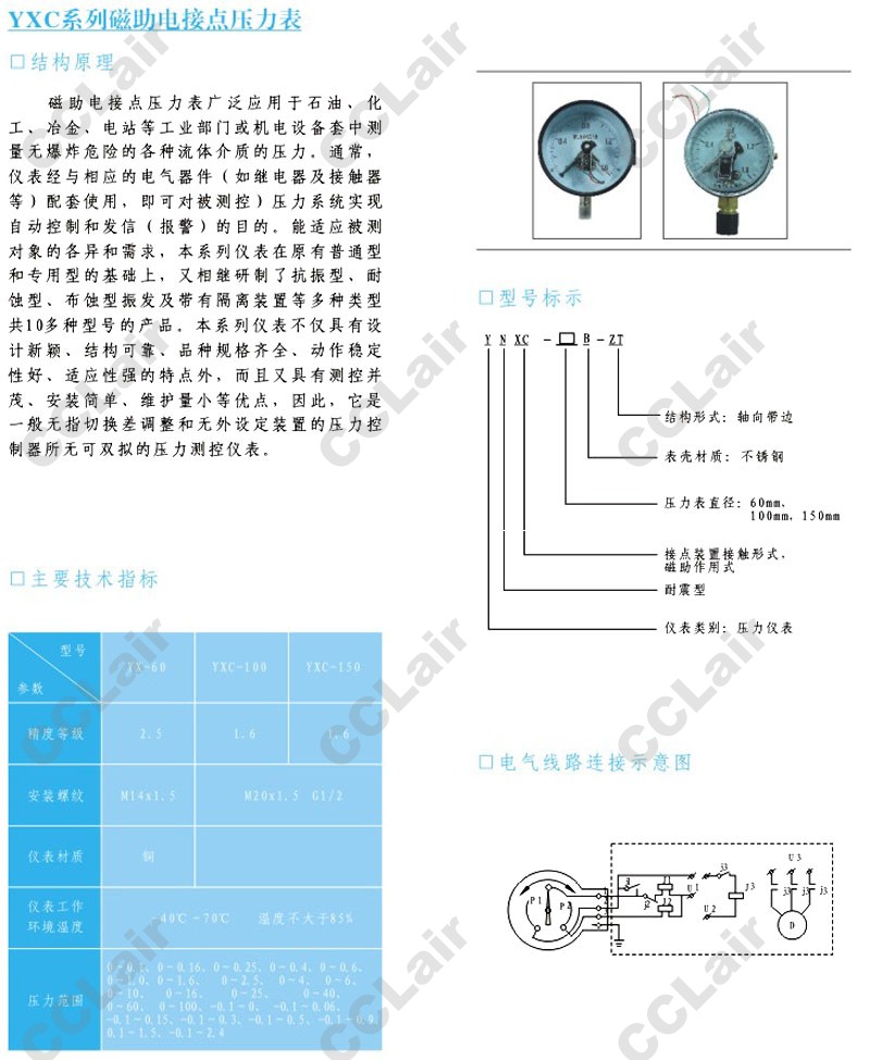 YX-60,YXC-100,YXC-150,磁助電接點(diǎn)壓力表,CCLair