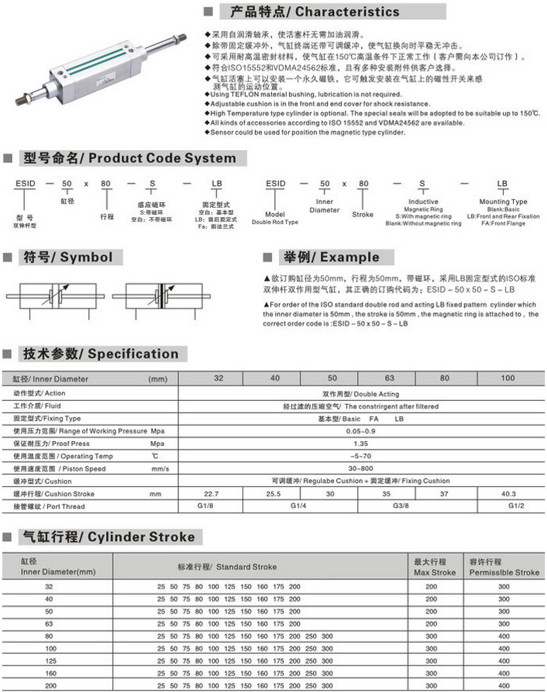 ESID-32*25-S,ESID-40*50-S,ESID-50*75-S,ESID-63*80-S,ESID-80*100-S,標(biāo)準(zhǔn)氣缸