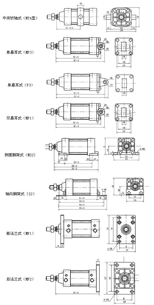 | 缸徑(Ф) | F | FB(Ф) | R | TF | UF | ZF | E | LH | SS | ST | SU | SY | TS | US | XS | XW | ZS | AB(Ф) | AE | AH | AL |