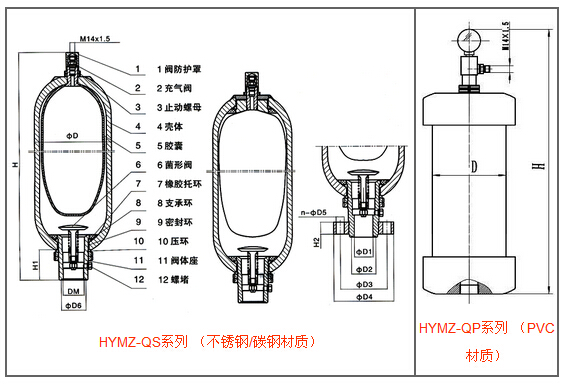 殼體材質(zhì):不銹鋼、碳鋼。氣囊材質(zhì):丁腈橡膠、丁基橡膠、氟橡膠、三元乙丙橡膠、氯丁膠等。