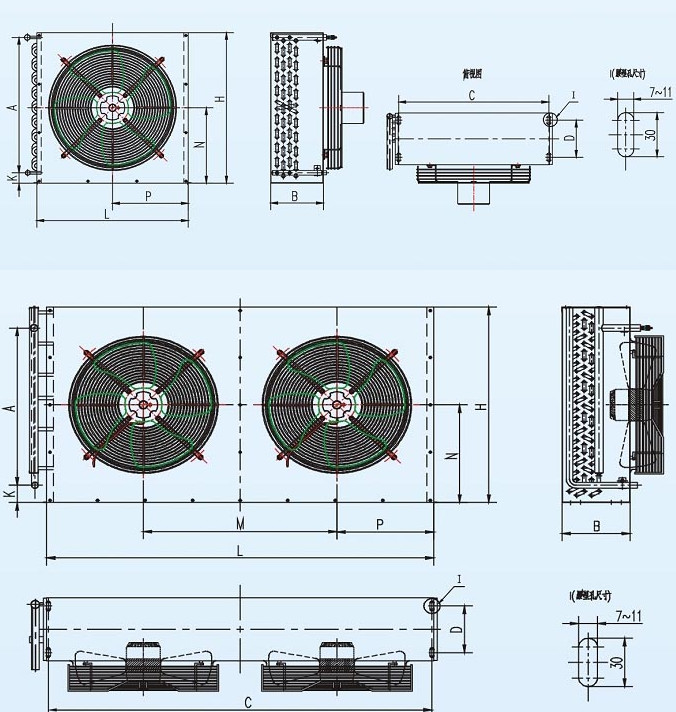 型號(hào) Model 換熱量 Heat exchange capacity (kW) 面積Surface (m2) 排環(huán)數(shù) Copper pipe arrangement 風(fēng)扇電機(jī)Fan 進(jìn)氣管 Air inlet Ø (mm) 出液管Liquid outlet Ø(mm) 重量weight (kg)