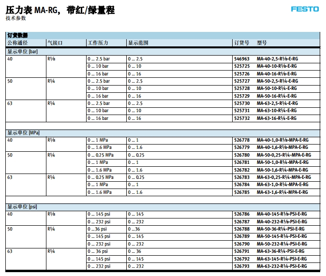 MA-40-2.5-R1/8,MA-50-10-R1/4,MA-63-16-R1/4-MPA-E-RG,festo壓力表 |