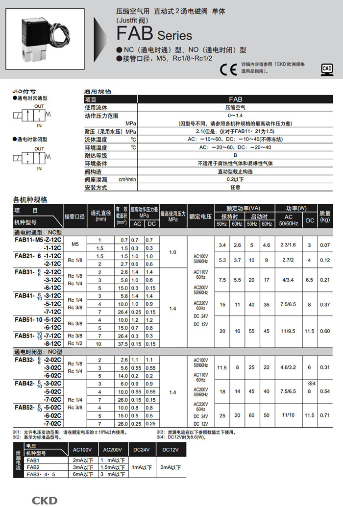 FAB11,FAB21,FAB31,FAB41,FAB51,FAB32,FAB42,FAB52,FAB11-M5-Z-12C,FAB52-10-7-02C,CKD直動式2通電磁閥