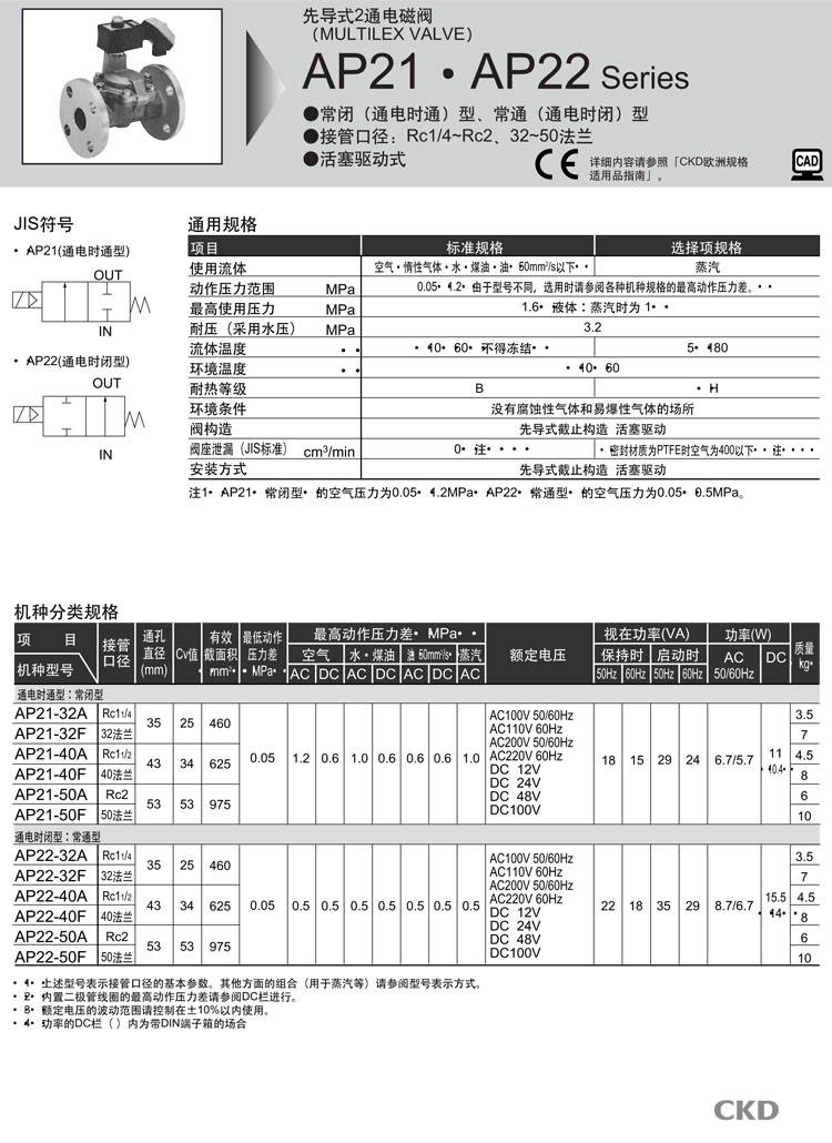 AP22-32A,AP22-32F,AP22-40A,AP22-40F,AP22-50A,AP22-50F,CKD先導(dǎo)式2通電磁閥