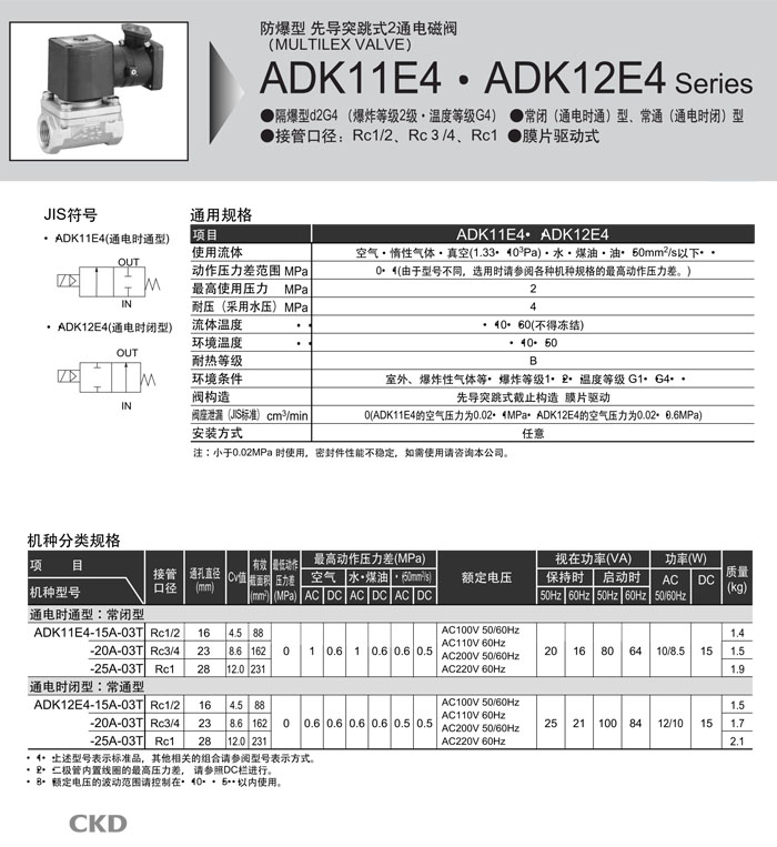 ADK11E4-15A,ADK11E4-20A,ADK11E4-25A,ADK12E4-15A,ADK12E4-20A,ADK12E4-25A,CKD先導(dǎo)式2通電磁閥