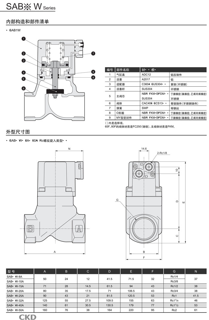 SAB1W-50,SAB2W-8,SAB2W-10,SAB2W-15,SAB2W-20,SAB2W-25,SAB2W-65,SAB2W-80,CKD氣控式2通閥
