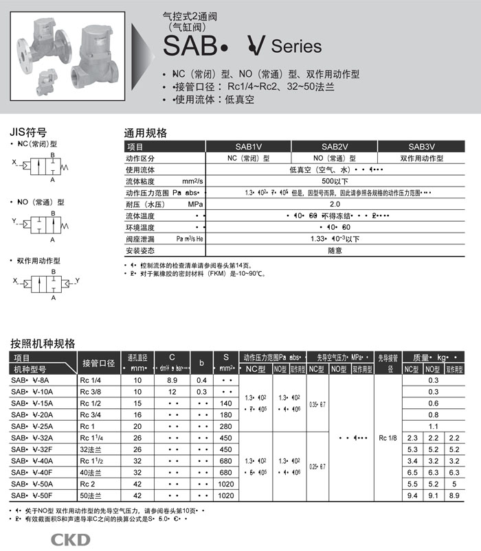 SAB1V-8A,SAB1V-10A,SAB1V-15A,SAB1V-20A,SAB1V-25A,SAB1V-32A,SAB1V-32F,SAB1V-40A,CKD氣控式2通閥
