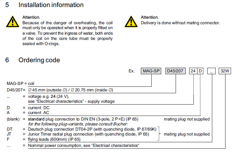 MAG-SP-D45/207-24D-27W,MAG-SP-D45/207-24D-DT-27W,MAG-SP-D45/207-24A-JT-27W,Bucher電磁閥線圈