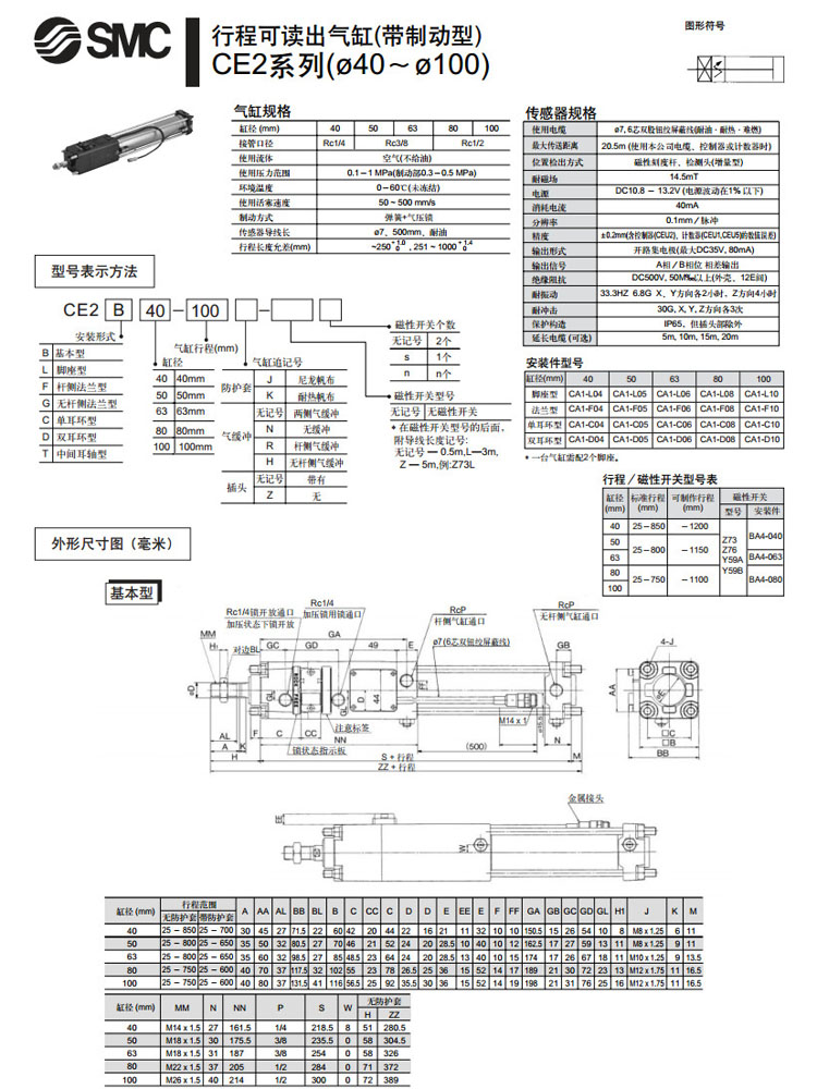 CE2B40-100,CE2L40-100,CE2F40-100,CE2G40-100,CE2C40-100,CE2D40-100,CE2T40-100,SMC行程可讀出氣缸