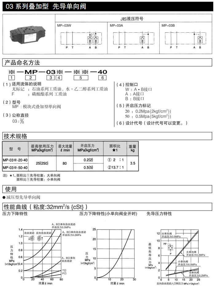 MP-03W-20-40,MP-03W-50-40,MP-03A-20-40,MP-03A-50-40,MP-03B-20-40,MP-03B-50-40,DAIKIN疊加型先導(dǎo)單向閥