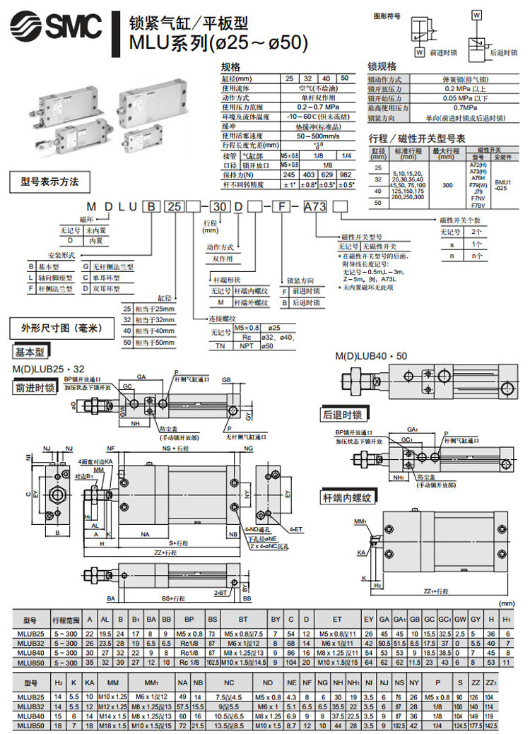MLUB25-5,MLUL25-5,MLUF25-5,MLUG25-5,MLUC25-5,MLUD25-5,MLUB32-5,SMC鎖緊氣缸