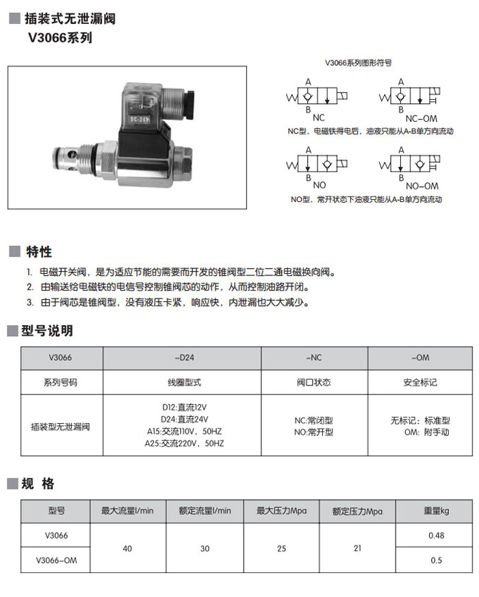 V3066-D12,V3066-D24,V3066-A15,V3066-A25,V3066-D12-NO-OM,V3066-A25-NC,插裝式無泄漏閥