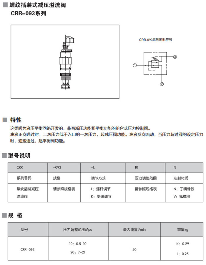 CRR-093-L10N,CRR-093-L20N,CRR-093-L10V,CRR-093-L20V,CRR-093-K10N,CRR-093-K20N,螺紋插裝式減壓溢流閥