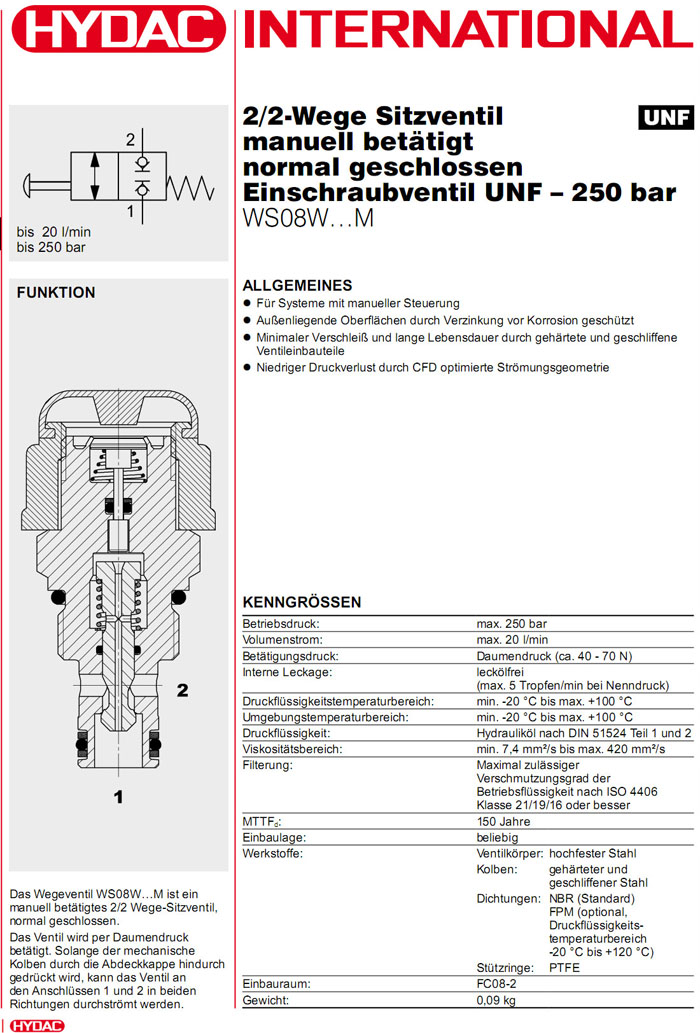 WS08WM-01-C-N,HYDAC手動致動2/2提升方向座閥